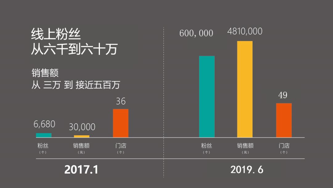 做一個(gè)對(duì)比,2017年1月份,我們的粉絲主要靠門店開業(yè)的時(shí)候地推,就是你關(guān)注我們的微信公眾號(hào),送你一個(gè)東西,這是傳統(tǒng)的玩法,特別苦,每次開業(yè)有5000人光顧門店,一天搞幾百個(gè)粉絲,被老板罵死。后來用有贊嘗試了第一次拼團(tuán)裂變,一天從幾百幾千的粉絲一下長到上萬的粉絲,太興奮了。