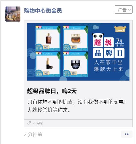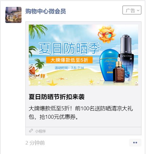 常州購物中心在當?shù)赜休^高知名度,并且有實體門店。投放前期,有贊廣告優(yōu)化師了解到,本次投放主要是配合常州購物中心的小程序商城活動進行售賣和引流。綜合需求,有贊廣告優(yōu)化師建議選擇朋友圈卡片廣告展現(xiàn)形式投放,用戶點擊廣告可直接跳轉(zhuǎn)到常州購物中心小程序商城進行下單購買,商品可到店自提。