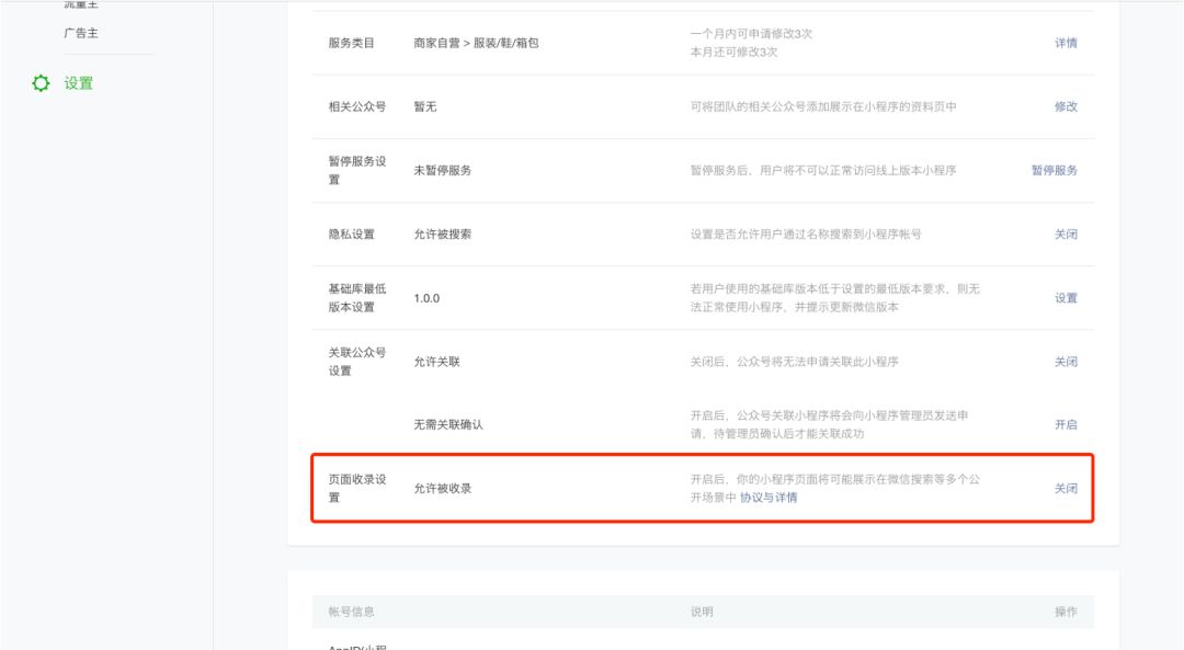 登錄微信小程序后臺(tái),在「設(shè)置」-「基本設(shè)置」下開(kāi)啟「頁(yè)面收錄」開(kāi)關(guān)(微信已默認(rèn)開(kāi)啟)