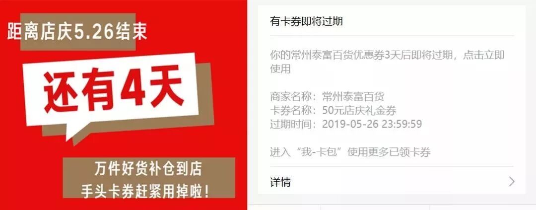 門店在核銷上,配合力度也很高。除此之外,泰富不僅在公眾號文章頁發(fā)布了到期提醒,還利用微信卡券自帶的「到期提醒」功能,在卡券到期前 3 天給用戶推送小程序消息,提醒用戶使用卡券消費,進一步促進卡券核銷。