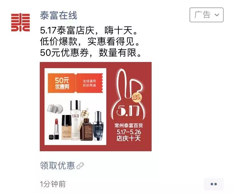常州泰富百貨商場(原常州商業(yè)大廈)創(chuàng)建于1993年,是泰富集團起步時的第一家百貨零售店。為了擴大活動宣傳力度,吸引更多顧客到店,泰富百貨在 25 周年店慶期間,選擇通過有贊廣告投放系統(tǒng)投放騰訊社交廣告。在投放期間累計曝光 500+ 萬次,卡券核銷率 30%,ROI 高達 1:58。
