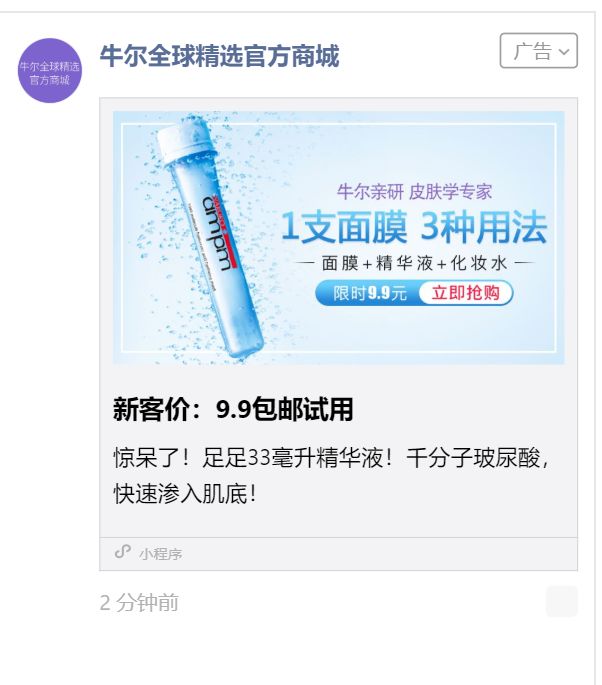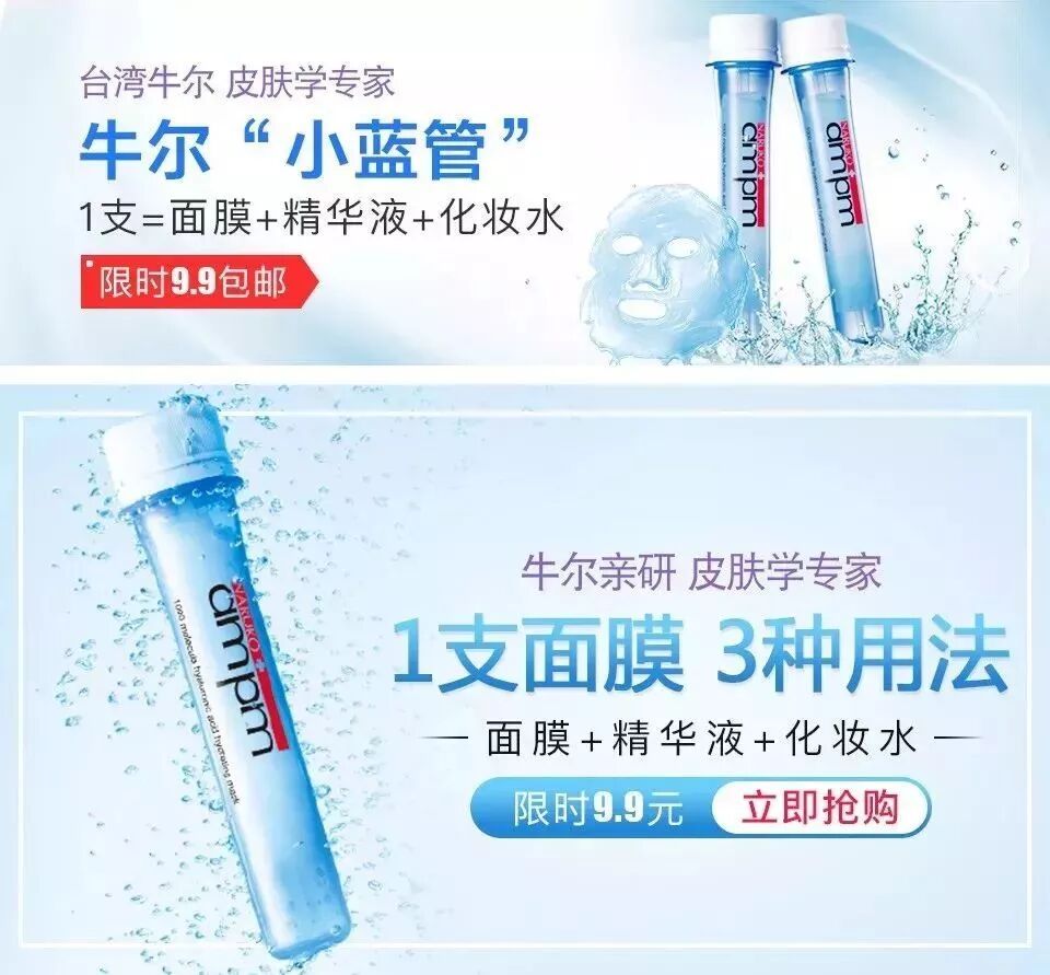 牛爾親研本次投放的產(chǎn)品是 9.9 元/支的試管面膜,希望能靠低單價(jià)的商品來吸引用戶,實(shí)現(xiàn)拉新引流的效果。