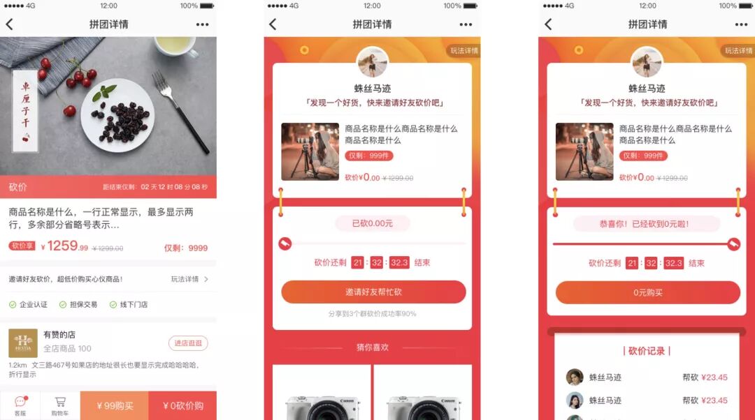 砍價0元購,即用戶選擇心儀商品發(fā)起砍價活動,分享給多個好友后,通過好友的助力,使商品價格不斷降低,當(dāng)足夠人數(shù)的好友助力砍價后,砍到商品最低價格(可以為0元)后,用戶可以按照此價格下單,獲得該商品。同時幫助該用戶砍價的好友,看到此活動后,也可以發(fā)起砍價,邀請更多人參與到砍價活動中,實現(xiàn)粉絲裂變增長的目的。