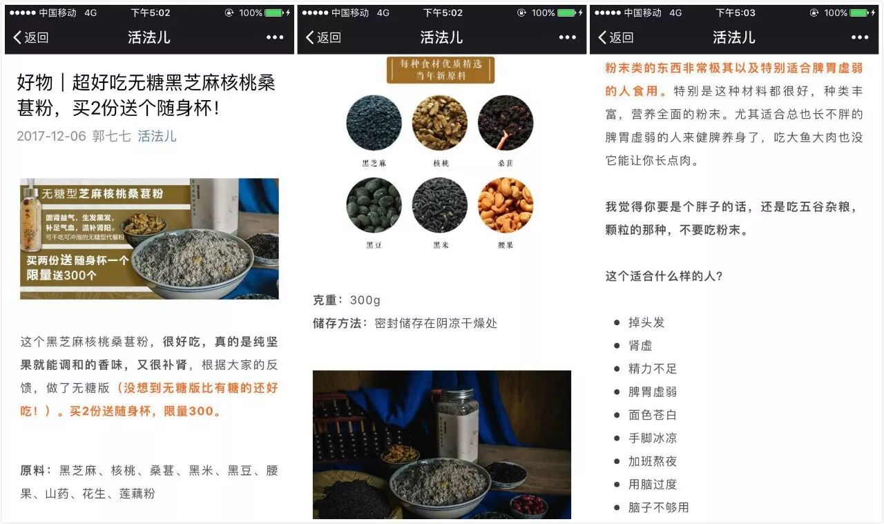 為了方便分銷商在公眾號內推廣商品,鵲草會提供給分銷商制作好的能夠直接引導購買的圖文素材,內容主要包括產(chǎn)品簡介、適用人群、食用方法等,搭配拍攝精美的產(chǎn)品多角度照片,3步直接引導粉絲購買,如下:
