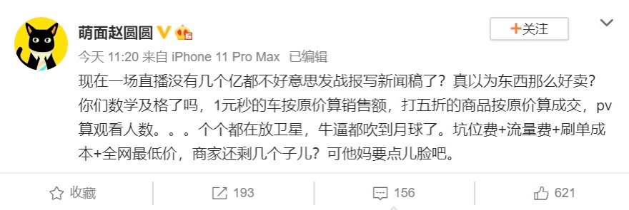 而身處行業(yè)變動中的人,感受不盡相同。有人覺得部分主播忽悠能力太強(qiáng),有人覺得風(fēng)口還會持續(xù)一段時間,但從業(yè)者都觀察到,行業(yè)還處于發(fā)展初期。前淘寶直播運營負(fù)責(zé)人趙圓圓說,“疫情催熟了直播,讓電商直播往前邁了一大步,但本來這個小孩就念初中念得磕磕巴巴,是小學(xué)生水平,你非要說他是個天才,去念初中他跟不上?!眳菚圆ㄕJ(rèn)為,直播帶貨處于野蠻生長期,600%的復(fù)合增長,亂象叢生。多年電商從業(yè)者、百聯(lián)咨詢創(chuàng)始人莊帥告訴毒眸,“進(jìn)化的階梯,就是盲目和沖動,所以還會有人入局。我年初的時候說了,直播帶貨應(yīng)該還會有兩年左右的周期,還會狂熱的。”“現(xiàn)在一場直播沒有幾個億都不好意思發(fā)戰(zhàn)報寫新聞稿了?!苯衲?月,趙圓圓曾發(fā)微博指出直播帶貨的巨大泡沫。如今,除了一個個越來越大的銷售數(shù)字,帶貨主播能講出來的故事越來越貧瘠了。首先翻車的是頭部主播們,比如辛巴和榮耀的爭議就是大主播和品牌博弈失敗的故事。8月30日,快手頭部主播辛巴上了熱搜,當(dāng)晚辛巴帶貨榮耀手機(jī),每款降價300元,他臨時要求榮耀多贈送一副耳機(jī),榮耀拒絕。辛巴稱,“我虧了4000萬交你這個品牌都沒交下,不好意思我不交了?!辈簧倬W(wǎng)友支持榮耀,認(rèn)為大公司有自己的審批流程。9月1日,辛巴發(fā)文道歉,稱己方只是與榮耀官方溝通時“產(chǎn)生了誤解”。沒過幾天,9月 2日,#辛巴張雨綺#又登上熱搜,因此前直播中,辛巴提到,6月和張雨綺合作的快手直播中,張雨綺讓定價4299元的手機(jī)以3899元的價格出售,實際是辛巴補(bǔ)貼了1200萬。當(dāng)日晚間,快手電商發(fā)布微博稱:實際雙方補(bǔ)貼金額不超過600萬,其中來自張雨綺直播間的費用已由快手官方承擔(dān)。有網(wǎng)友評論道,“辛巴想從規(guī)則的協(xié)商者,變成規(guī)則制定者,結(jié)果被啪啪啪打臉?!?/span>今年上半年,劉濤、陳赫、汪涵等明星都做起了帶貨主播。僅“618”期間,淘寶就邀請了300位明星開展直播帶貨。不同于之前的熱火朝天,部分明星帶貨主播已偃旗息鼓,如袁姍姍和薛之謙只在6月分別直播了1場和2場,帶貨總額均停留在千萬級,此后基本停播。有的明星主播,單場銷售數(shù)據(jù)極低。據(jù)21Tech報道,7月初的直播中,小沈陽帶貨20件,退貨16件;葉一茜賣單價200多塊的茶具,90萬人觀看,成交不到2000元。而在果集數(shù)據(jù)公布的7月TOP50帶貨主播中,淘寶平臺的明星主播有吉杰、劉濤、小李琳、劉玉婷、林依輪,成績最好的是排第16位的劉濤,GMV約為1.18億元;抖音平臺上榜的明星主播是羅永浩,GMV約為6543萬元,位列第34位。兩類頭部流量頻頻翻車背后,暴露的是直播帶貨行業(yè)熱潮退去,實際的帶貨大盤并沒有大家想象的那么大。而在這樣一個并不足夠的大盤里,缺乏競爭力的主播和機(jī)構(gòu)都在裸泳。不少MCN機(jī)構(gòu)沒有流量和行業(yè)經(jīng)驗,主播帶貨能力匱乏。而毒眸此前的文章(MCN大撤退)也提到,MCN發(fā)展過于迅速,預(yù)計2020年將達(dá)到28000家。機(jī)構(gòu)太多,主播卻不夠用了。在《中國新聞周刊》的采訪中,有商家表示,和中腰部主播合作就是交學(xué)費的過程,“因為自己都不知道對方的粉絲是死粉還是活粉”。當(dāng)然,粉絲多也不意味著能帶貨。近日,抖音3000多萬粉絲的媒體大號“四川觀察”進(jìn)行了一場直播帶貨,而據(jù) “姜茶茶”消息,該次直播一共45個商品,單個商品的坑位費最低也要7萬元。但蟬媽媽統(tǒng)計的這場帶貨總流水僅138萬。