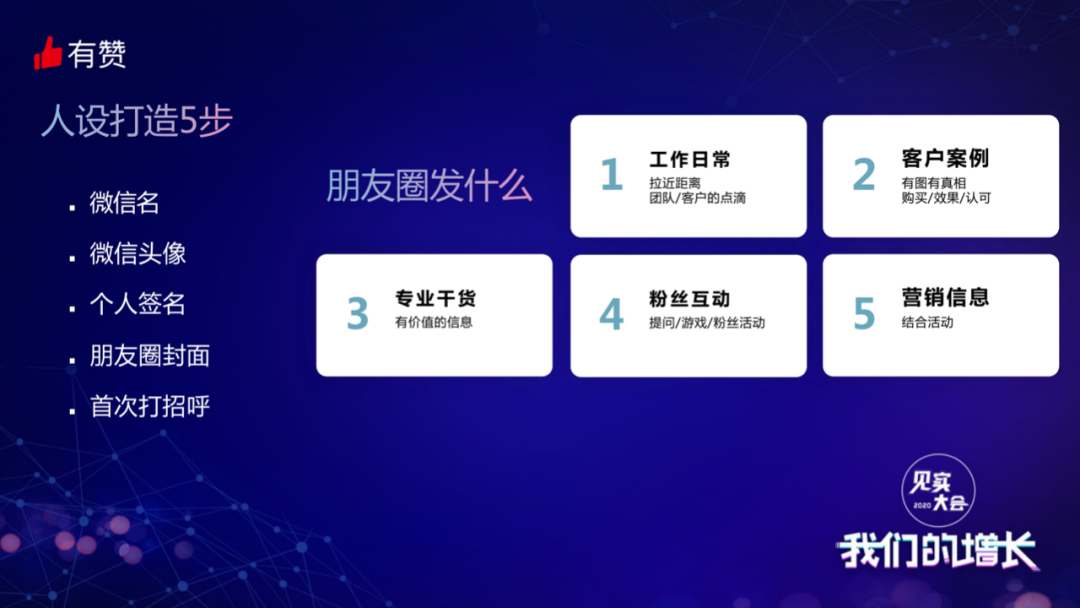 步驟之四,社群運(yùn)營。社群起到了非常至關(guān)重要的樞紐作用,公眾號,個人號,微信群,直播,小程序,是一套組合,密不可分。其中人設(shè)的打造很重要,包括怎么發(fā)朋友圈等。