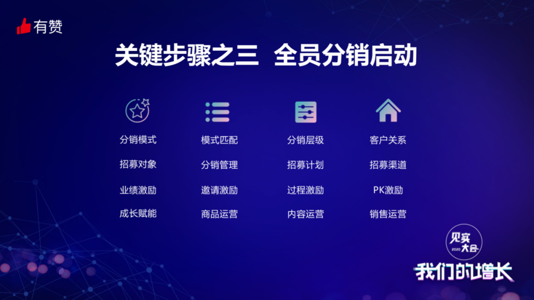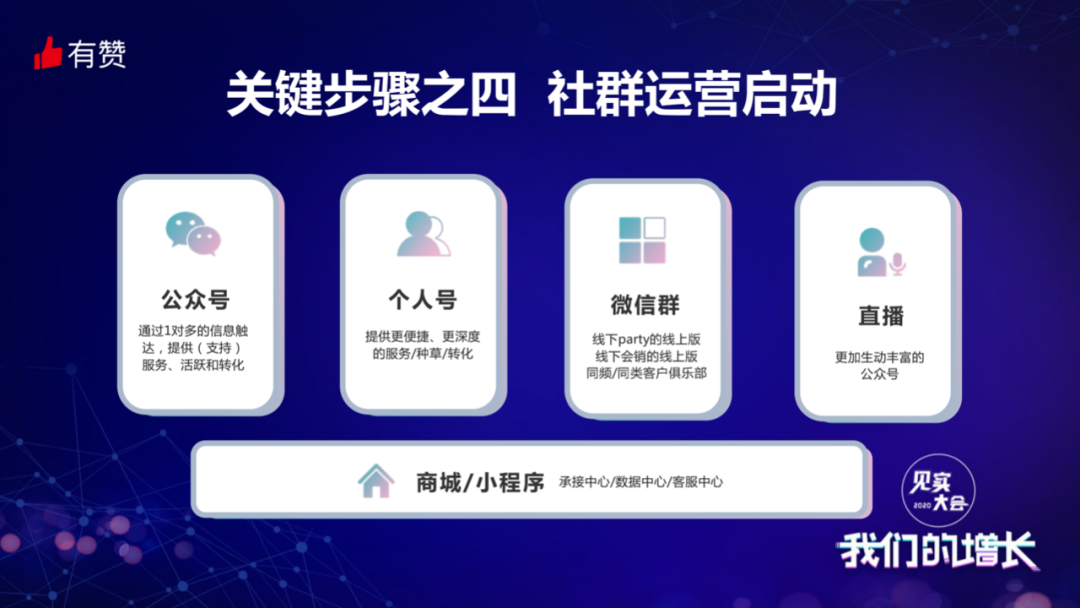 在數(shù)字化轉(zhuǎn)型過程中,更多需要的是企業(yè)的變革之旅。如組建領(lǐng)導(dǎo)團(tuán)隊,若沒有一把手去做這件事,將會是巨大挑戰(zhàn)。還有專業(yè)的運(yùn)營賦能,如有贊提供了技術(shù)、工具方面的賦能,但是從營銷、團(tuán)隊管理、運(yùn)營上,還需要外邊更多團(tuán)隊來幫助大家。還有積累短期勝利,如果企業(yè)沒有看到短期成果很容易喪失信心,團(tuán)隊中的負(fù)面聲音也會越來越大。
