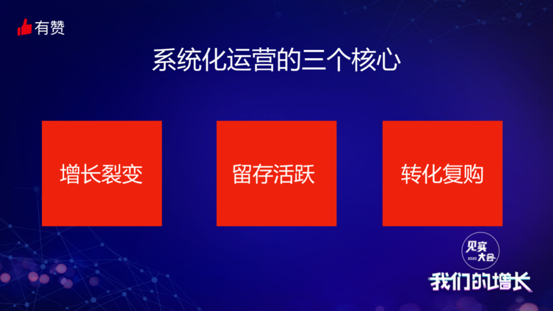 這是系統(tǒng)化運(yùn)營的三個核心:增長裂變、留存活躍、轉(zhuǎn)化復(fù)購。