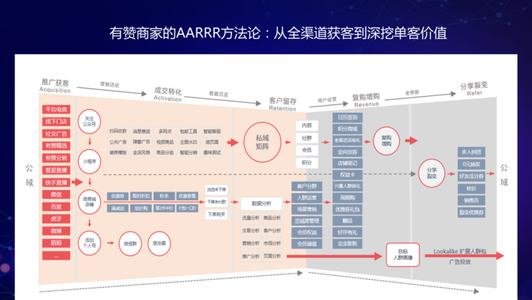 其中有贊有一個方法論,AARRR模型,很重要的部分在這個“R”,即客戶留存和增購復(fù)購的方面我們要做很多努力,要給消費(fèi)者制造很好的內(nèi)容,有效聯(lián)動他,讓他長此以往留存在這里,去增購、復(fù)購。