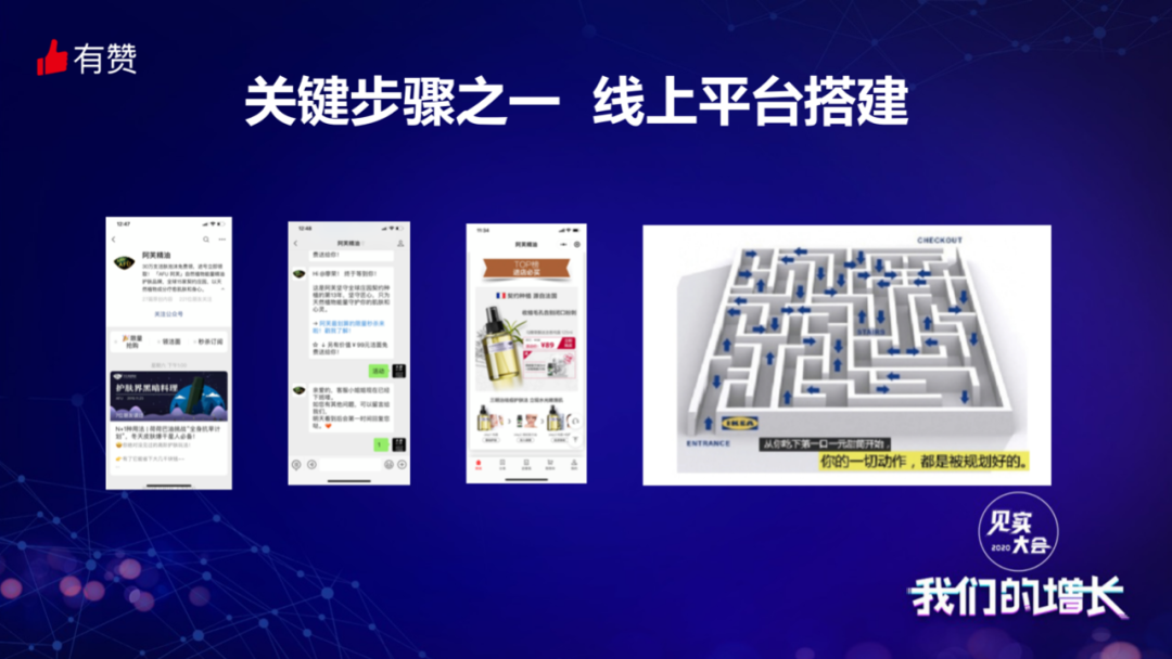 步驟之一,線上平臺的搭建。在線下門店,用戶從一進(jìn)門到離開門店的路徑,都是提前設(shè)計好的,如下圖右側(cè),就是宜家線下門店的整個用戶軌跡設(shè)計。但如果把這個軌跡移到線上,很多人就會忽略掉,比如從用戶一開始關(guān)注公眾號、接收到自動彈出的信息、到瀏覽小程序的軌跡。