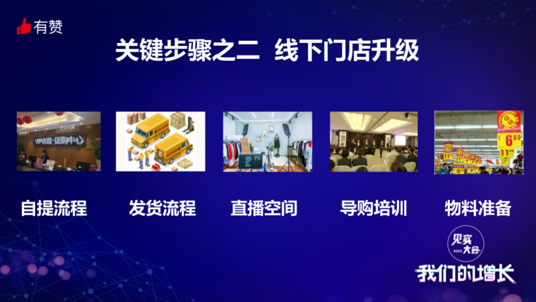 步驟之二,線下門店的升級。比如自提流程、發(fā)貨流程。消費(fèi)者在線下單后,各個品牌的商店都需要一個團(tuán)隊去專柜撿貨,驗貨。還要有自己的直播空間,導(dǎo)購可以在閑暇時間做直播,和客戶介紹專業(yè)知識。還需要對導(dǎo)購進(jìn)行培訓(xùn),包括怎么分享、發(fā)朋友圈等等。這些都可以幫助線下門店升級。