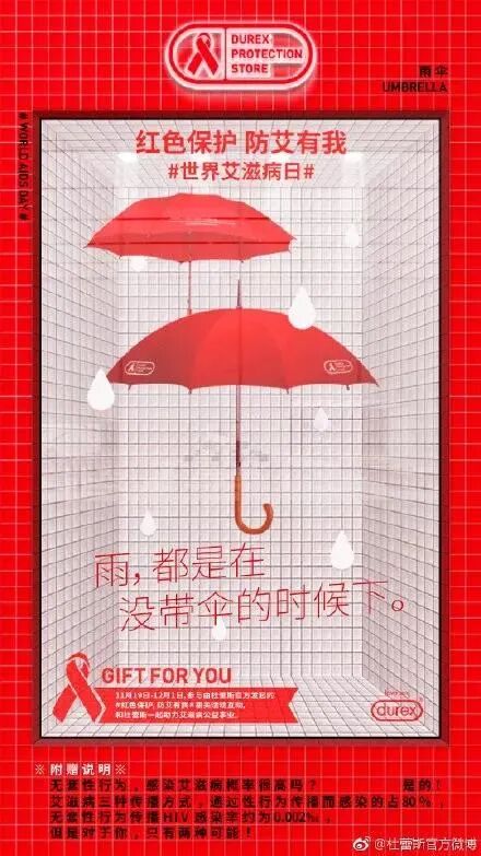 當然,要有故事上的代入感,生活中常見的事物也必不可少。比如杜蕾斯的文案,就運用“傘”這個日常用品,將我們一下子拉到了一個下雨的故事里。