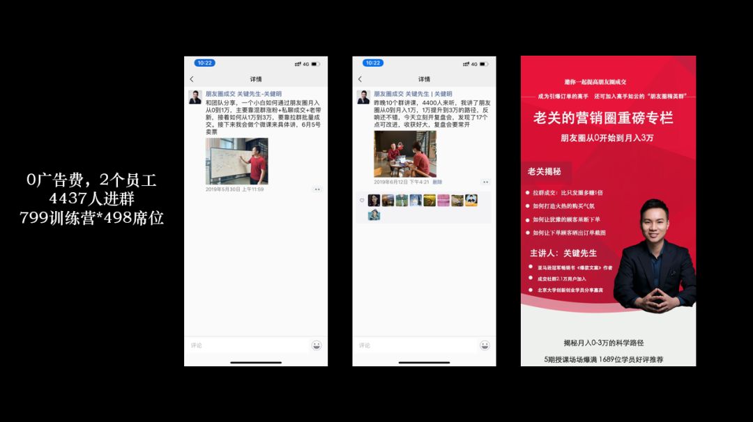 私域流量不投平臺,他培養(yǎng)自己的銷售隊伍。他只招畢業(yè)1-2年的新人,每個員工入職后,培訓(xùn)他學(xué)會裂變和運營。由公司提供1個100人的顧客群,員工有辦法裂變出下一個100人群,如此源源不斷地裂變出新群。且他們有辦法成交,每個群成交5個人,成交一套課收299元,如此每個群可收1500元左右。