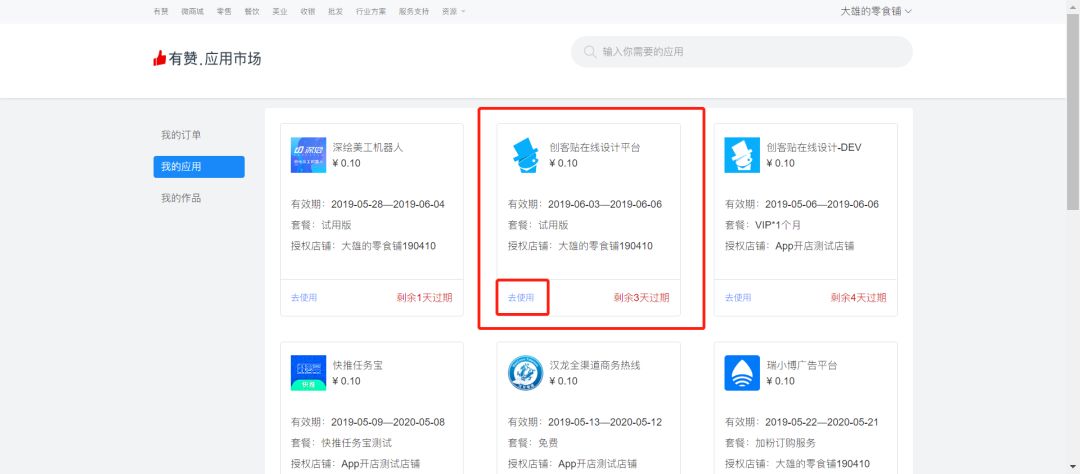 途徑 1 :商家在應(yīng)用市場(chǎng)中【個(gè)人中心】-【我的應(yīng)用】中,找到你已訂購(gòu)的創(chuàng)客貼應(yīng)用并點(diǎn)擊去使用。