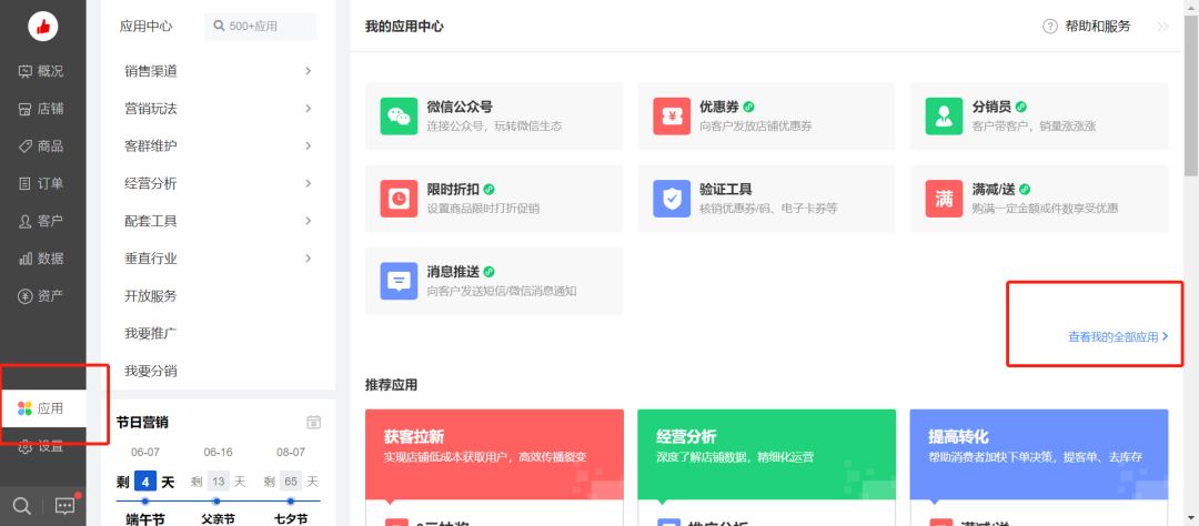 途徑 2 :商家可以在微商城后臺(tái)【應(yīng)用】-【我的應(yīng)用中心】-右下角查看我的全部應(yīng)用【第三方應(yīng)用】中找到你已訂購(gòu)的創(chuàng)客貼應(yīng)用并點(diǎn)擊去使用。