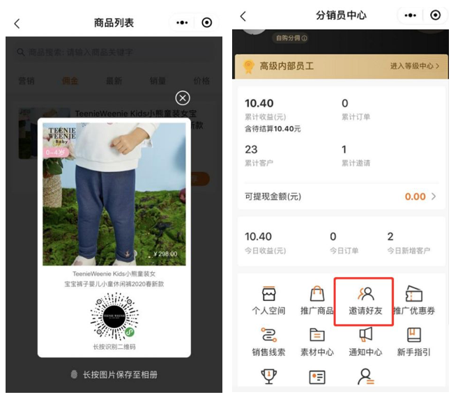 在店鋪小程序上線第一天,Teenie Weenie共有超過7000個(gè)銷售員開通權(quán)限成為銷售員。借助有贊的銷售員功能,Teenie Weenie將門店導(dǎo)購甚至全體員工全部轉(zhuǎn)化為線上分銷團(tuán)隊(duì),在朋友圈和社群營銷進(jìn)行線上獲客、線上成交。