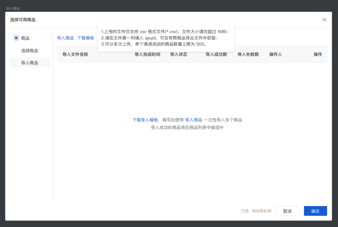 商品批量導(dǎo)入使用方法與有贊其它營(yíng)銷(xiāo)插件一致,在頁(yè)面內(nèi)下載導(dǎo)入模板,本地編輯商品信息后,再上傳文件實(shí)現(xiàn)商品批量導(dǎo)入。連鎖商家單個(gè)活動(dòng)適用店鋪數(shù)很多時(shí),導(dǎo)入時(shí)間可能會(huì)有一點(diǎn)慢,請(qǐng)稍事等待。