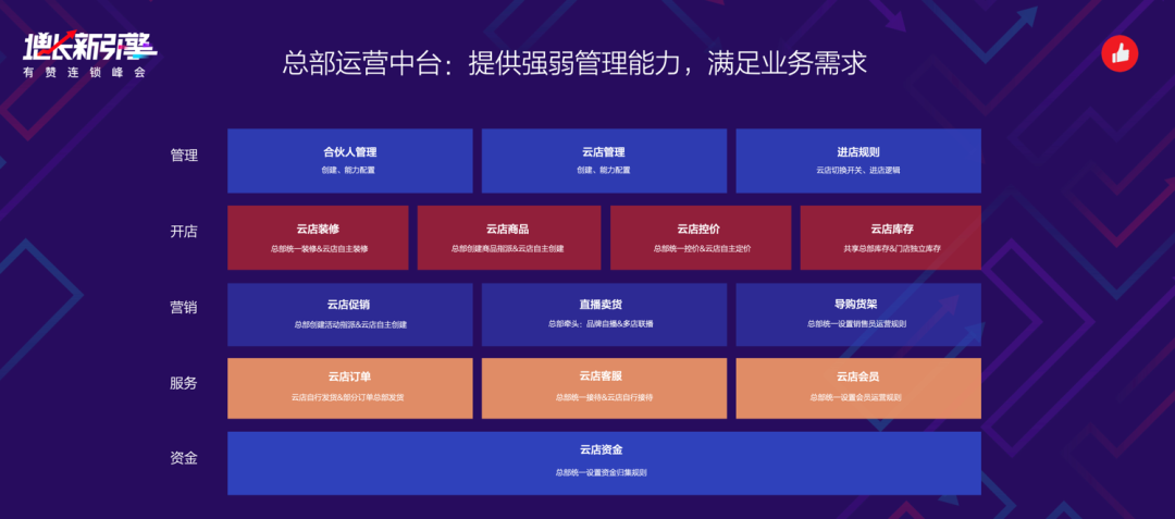 為什么有贊能快速幫助大家去做連鎖多級架構(gòu),原因在于這么多年有贊微商城在行業(yè)里有極好的口碑,我們把這個(gè)產(chǎn)品做了升級,升級完后有贊連鎖就可以給每一個(gè)品牌商的總部提供一個(gè)強(qiáng)大的運(yùn)營中臺,擁有店鋪管理、商品管理、訂單管理、營銷、客戶、資金等能力。