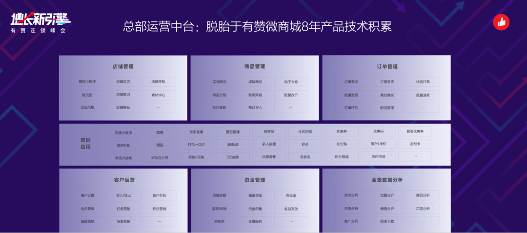 為什么有贊能快速幫助大家去做連鎖多級(jí)架構(gòu),原因在于這么多年有贊微商城在行業(yè)里有極好的口碑,我們把這個(gè)產(chǎn)品做了升級(jí),升級(jí)完后有贊連鎖就可以給每一個(gè)品牌商的總部提供一個(gè)強(qiáng)大的運(yùn)營(yíng)中臺(tái),擁有店鋪管理、商品管理、訂單管理、營(yíng)銷、客戶、資金等能力。