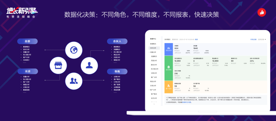在數(shù)據(jù)化層面,有贊連鎖能基于總部、合伙人、門店、導(dǎo)購每一層不同的角色,通過不同的報(bào)表去幫助整個(gè)層級數(shù)做據(jù)化決策,讓每個(gè)層級的決策更高效、更堅(jiān)定。