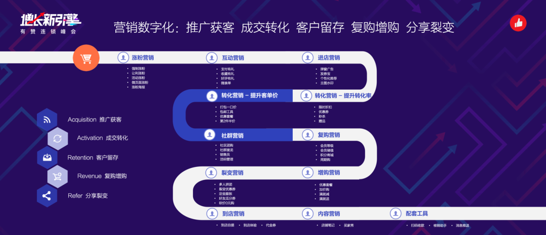 營(yíng)銷數(shù)字化是有贊到今天為止最被商家認(rèn)可的能力。有贊的產(chǎn)品營(yíng)銷能力很強(qiáng),玩法很多,一直在迭代更新?;贏ARRR模型,我們把營(yíng)銷拆成12個(gè)點(diǎn)。圍繞“推廣獲客、成交轉(zhuǎn)化、客戶留存、復(fù)購(gòu)增購(gòu)、分享裂變”這20個(gè)字,在每個(gè)節(jié)點(diǎn)上有贊都能提供強(qiáng)大的營(yíng)銷工具。
