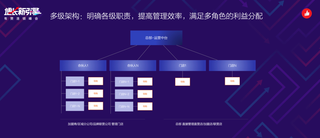 第二視角看藍(lán)線,我們?nèi)绾巫龉芾碣x能。要做管理賦能,產(chǎn)品必須滿足品牌商連鎖渠道多級管理架構(gòu)的模式,設(shè)置總部運(yùn)營中臺、合伙人系統(tǒng)、云店管理系統(tǒng),以及數(shù)據(jù)化決策系統(tǒng)。