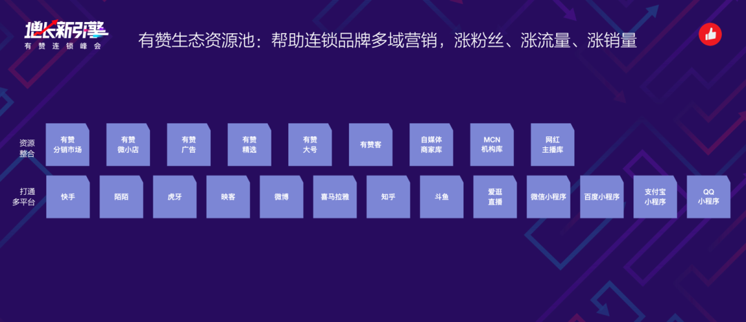 除了上述內(nèi)容,有贊還打造了生態(tài)資源池。從資源整合上來看,有贊有分銷市場、有贊廣告、有贊精選、有贊客;另外,有贊一直在持續(xù)打通多平臺,讓商家可以做多域營銷,目前我們打通的平臺包括快手、陌陌、虎牙、映客等等。