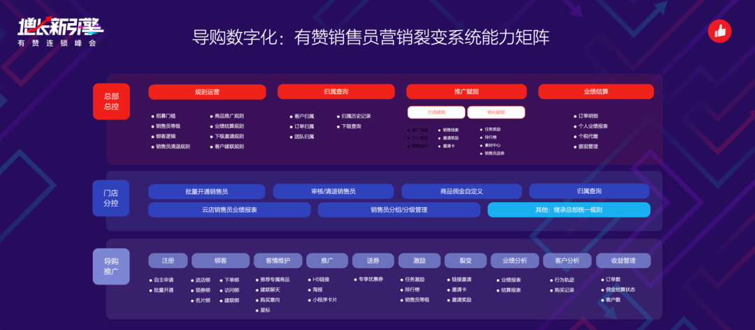 在有贊連鎖模式中,我們把銷售員做了升級,做到總部的總控,門店的分控,在每一層大家需要做的事情不一樣、總部需要設(shè)定好所有的規(guī)則,做好歸屬查詢,查詢每一個(gè)客戶、每一個(gè)商品、每一筆訂單,每一筆傭金歸屬哪一個(gè)門店,哪一個(gè)導(dǎo)購。