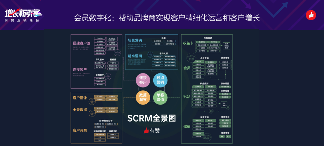 下面這張圖更精細(xì),這里包含客戶連接、觸點(diǎn)營銷、單客增值以及數(shù)據(jù)洞察所涉及的所有工具,即商家店鋪后臺客戶模塊的核心框架,有贊通過一套SCRM幫助客戶精細(xì)化運(yùn)營和客戶的持續(xù)增長。