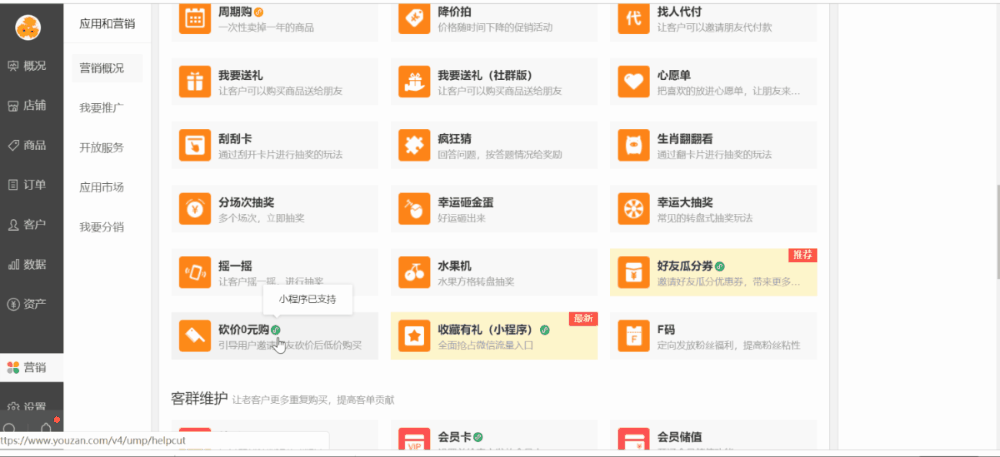 目前有贊小程序店鋪首頁支持多種方式進行砍價活動的推廣: