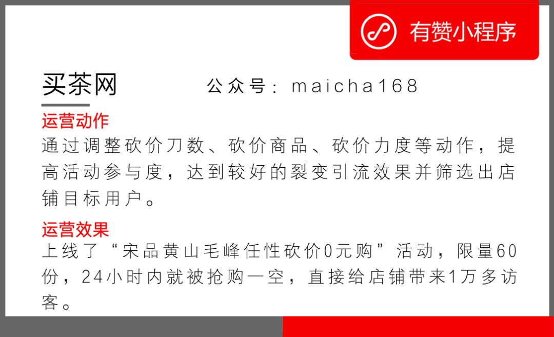買茶網(wǎng)是一家互聯(lián)網(wǎng)茶葉銷售平臺,今年7月份開通了有贊小程序店鋪,8月中旬參加了「砍價0元購」內(nèi)測并上線了“宋品黃山毛峰任性砍價0元購”活動,限量60份,24小時內(nèi)就被搶購一空,直接帶來給店鋪帶來1萬多的訪客。