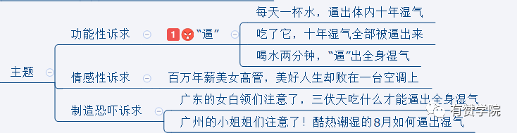 我分析以上5個(gè)功能的功能對(duì)標(biāo)產(chǎn)品,發(fā)現(xiàn)他們?cè)谕茝V時(shí)都有一兩個(gè)重合之處,我羅列了關(guān)鍵詞分析:辦公室空調(diào)、天熱虛汗、容易頭暈感冒等。他們更多的指向一個(gè)點(diǎn):辦公室濕氣!