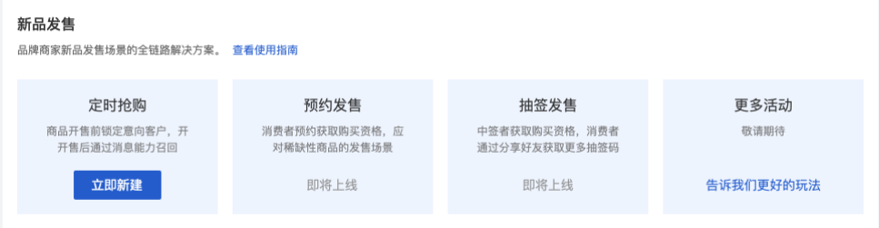 目前,此解決方案已進入內(nèi)測階段,預(yù)計 9 月下旬全面上線,有需要商家可申請?zhí)崆笆褂茫ǖ赇伣谌粲行缕钒l(fā)布計劃,可咨詢服務(wù)經(jīng)理)。功能上線后,商家可在有贊后臺創(chuàng)建新品發(fā)售活動,第一期功能已支持定時搶購模式,之后會逐步推出預(yù)約發(fā)售、抽簽發(fā)售等活動模式。