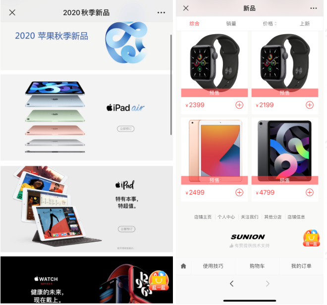 發(fā)布會結(jié)束后,作為蘋果公司在中國市場全線產(chǎn)品的特級授權(quán)經(jīng)銷商,SUNION新聯(lián)于第一時間在其有贊微商城上線了新品預(yù)售活動。本次新品預(yù)售活動聯(lián)動SUNION新聯(lián)全國 74 家線下門店,同步開啟線上發(fā)貨+門店自提兩種預(yù)售模式。