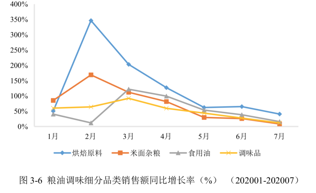 比較有意思的是烘焙原料的銷售增長(zhǎng),圖3-6可以看出,烘焙原料是糧油調(diào)味各品類中脫穎而出的一個(gè)細(xì)分品類,在今年2月份同比增幅達(dá)到了350%。這反映出疫情期間的消費(fèi)心態(tài),在家學(xué)習(xí)烘焙技藝的消費(fèi)者越來(lái)越多了。