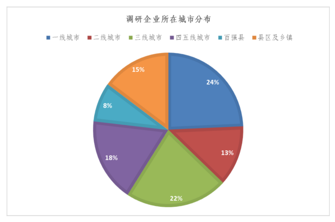 從城市分布來(lái)看,樣本企業(yè)分布較為均勻(如圖 4-3),其中一線城市占比 24%;二線城市企業(yè)樣本占比13%;三線城市企業(yè)樣本占比22%;四五線城市樣本占比18%;經(jīng)營(yíng)區(qū)域在區(qū)縣一級(jí)的樣本企業(yè)數(shù)共占比 22%。
