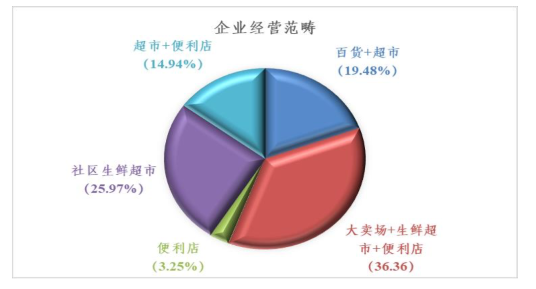 《報(bào)告》調(diào)研了154家企業(yè),包含超市、百貨、便利店等各種業(yè)態(tài)。在調(diào)研樣本中,大賣場(chǎng)+生鮮超市+便利店的經(jīng)營(yíng)業(yè)態(tài)最多,占比 36.36%,其他依次是社區(qū)生鮮超市 (25.97%)、百貨+超市(19.48%)和超市+便利店(14.94%)的經(jīng)營(yíng)業(yè)態(tài)?!揪幷咦ⅲ河捎诖蠖鄶?shù)調(diào)研企業(yè)是多個(gè)業(yè)態(tài)同時(shí)經(jīng)營(yíng),因此有了不同業(yè)態(tài)組合的情況?!?/p>