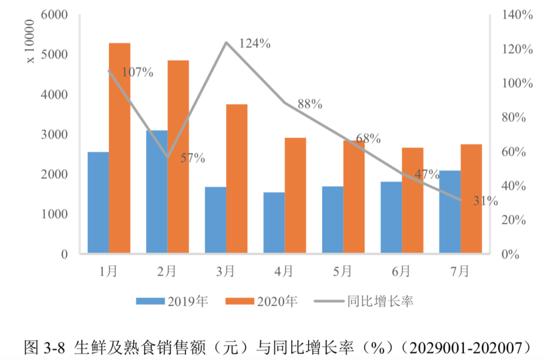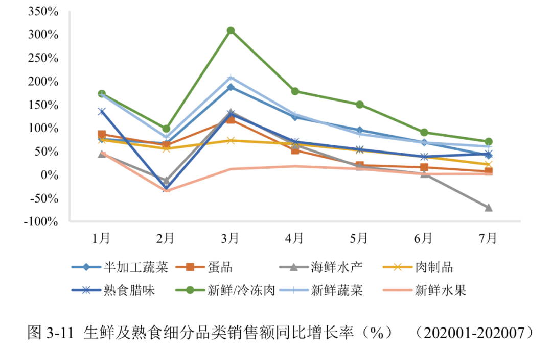 如圖3-8所示,生鮮與熟食是一直保持同比增長(zhǎng)的一個(gè)品類,即便是到了7月份,依然有31%的同比增長(zhǎng)。需要關(guān)注的是生鮮中的海鮮水產(chǎn)品類,如圖3-11所示,海鮮水產(chǎn)在7月份出現(xiàn)了明顯的負(fù)增長(zhǎng)。這與北京新發(fā)地爆發(fā)的二次疫情關(guān)聯(lián)較大。當(dāng)時(shí)有媒體稱,在北京新發(fā)地市場(chǎng)進(jìn)口三文魚切割案板檢測(cè)出新冠病毒,進(jìn)而波及全國(guó)。