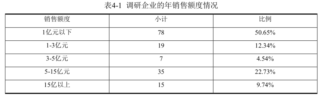 從樣本企業(yè)規(guī)模來(lái)看(如表4-1 所示),半數(shù)樣本企業(yè)年銷售額在1億元以下(占比 50.65%),1-3 億的企業(yè)有19 家(占比12.34%),3-5 億的有7家(占比 4.54%),年銷售額超過(guò)5億的樣本企業(yè)共50家(占比32.47%)。