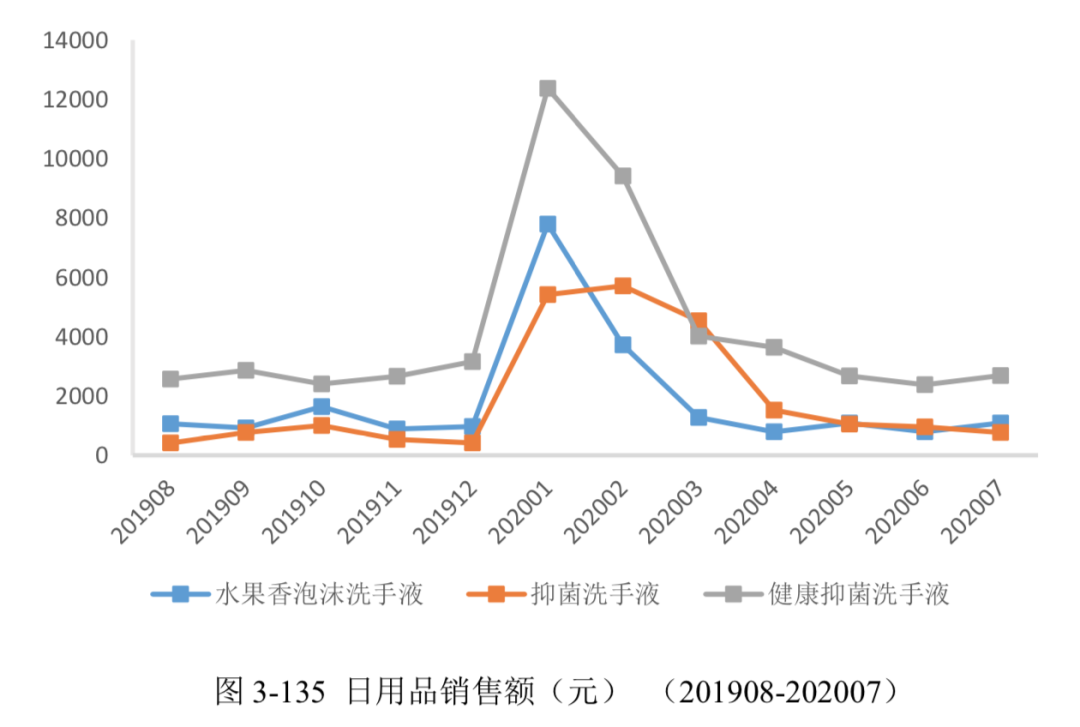 值得關(guān)注的是,在疫情期間供不應(yīng)求的消殺類用品并沒(méi)有如期成為一個(gè)增長(zhǎng)品類。從圖3-135、3-137可以看出,4月份之后各類抑菌洗手液銷量迅速下滑,與去年同期相比,增長(zhǎng)并不顯著。