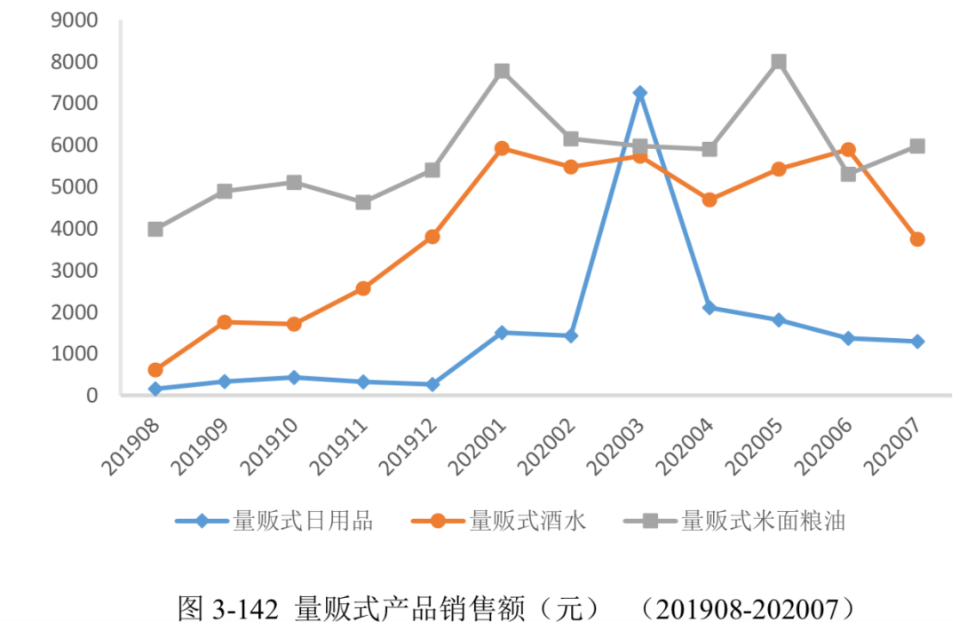 如圖3-3所示,作為民生商品,糧油品類1-7月份同比去年都是增加的,特別是在今年3月,同比增長(zhǎng)高達(dá)106%,當(dāng)時(shí)也是疫情管控最嚴(yán)格的時(shí)期,很多消費(fèi)者居家生活,這使得該品類達(dá)到了增長(zhǎng)高峰。