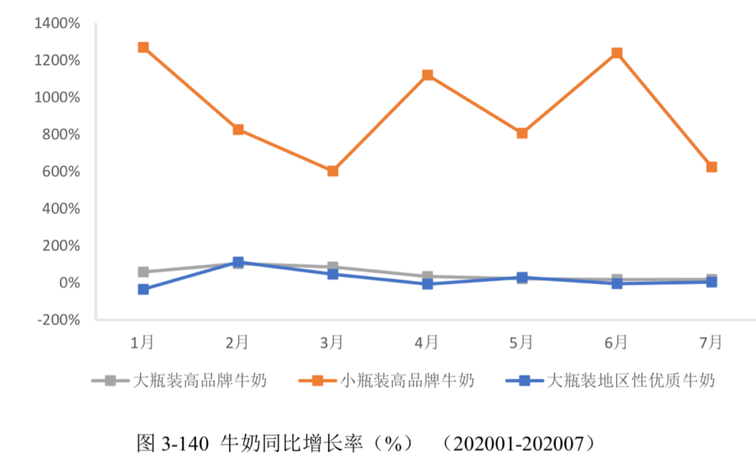第三個(gè)趨勢(shì)是,消費(fèi)者對(duì)品質(zhì)追求不變,在收入減少的情況下,要吃的“少而精”。以牛奶為例,如圖3-140所示,小包裝的高端牛奶銷售增幅要高于大包裝的高端牛奶和區(qū)域品牌的牛奶。