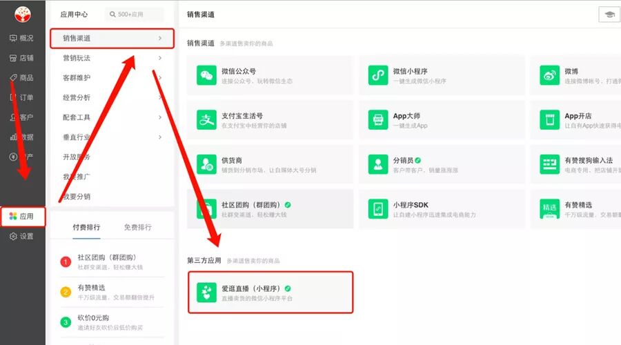 申請方式:登錄有贊微商城,打開「微商城后臺-應(yīng)用-銷售渠道-愛逛直播」即可申請。